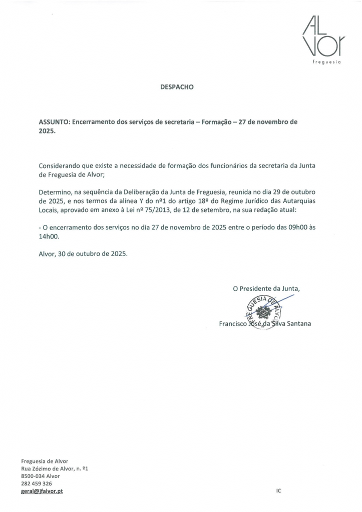 Encerramento dos Serviços de Secretaria no dia 27 de novembro de 2025