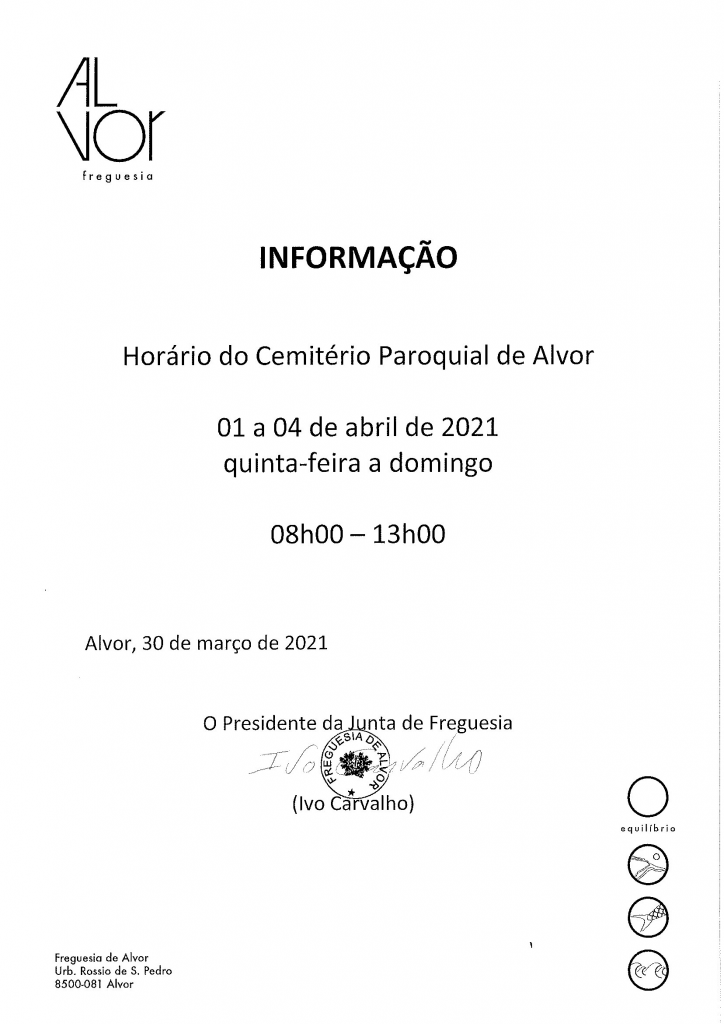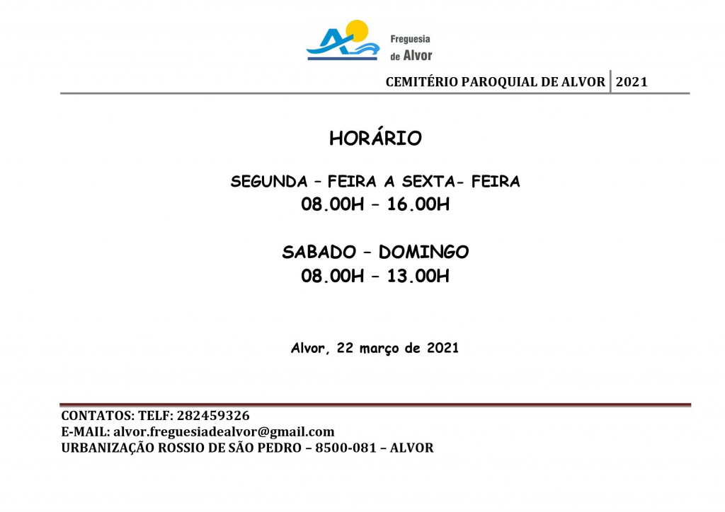 Cemitério Paroquial de Alvor - Horário 1 a 4 Abril de 2021